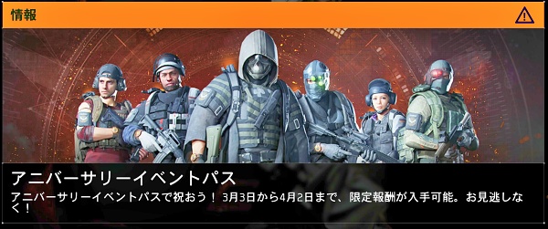 - アニバーサリーパス: 6種類の新しいタクティカル・ユニフォーム(衣装)を収録。