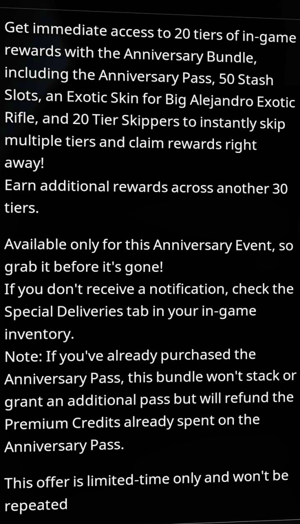 すでにアニバーサリー・パスを購入済みの状態でこのバンドルを購入した場合、パスが重複したり追加のパスが付与されたりはしませんが、パス購入時に消費したプレミアムクレジットが払い戻されます。