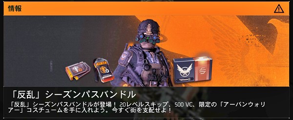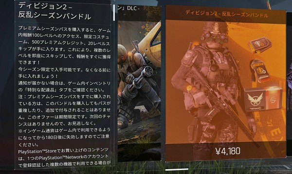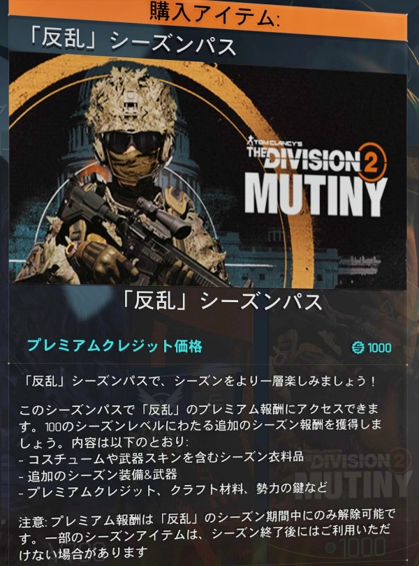 オプションとして提供される「シーズンパス」は、『The Division® 2』のすべてのプレイヤーがレベル1から購入可能で、ゲーム内ストアにて1000プレミアムクレジット($9.99または地域に応じた相当額)で販売されています。