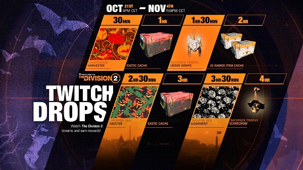10月21日から11月4日までの期間中、Twitchで『The Division 2』の配信を視聴すると、限定のハロウィーン報酬が獲得できます。