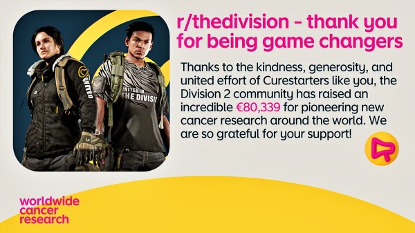 最先端のがん研究を支援するために寄せられた、『ディビジョン2』コミュニティの皆様の温かいご厚意と、その寛大なご支援に、心から感謝の意を表します。